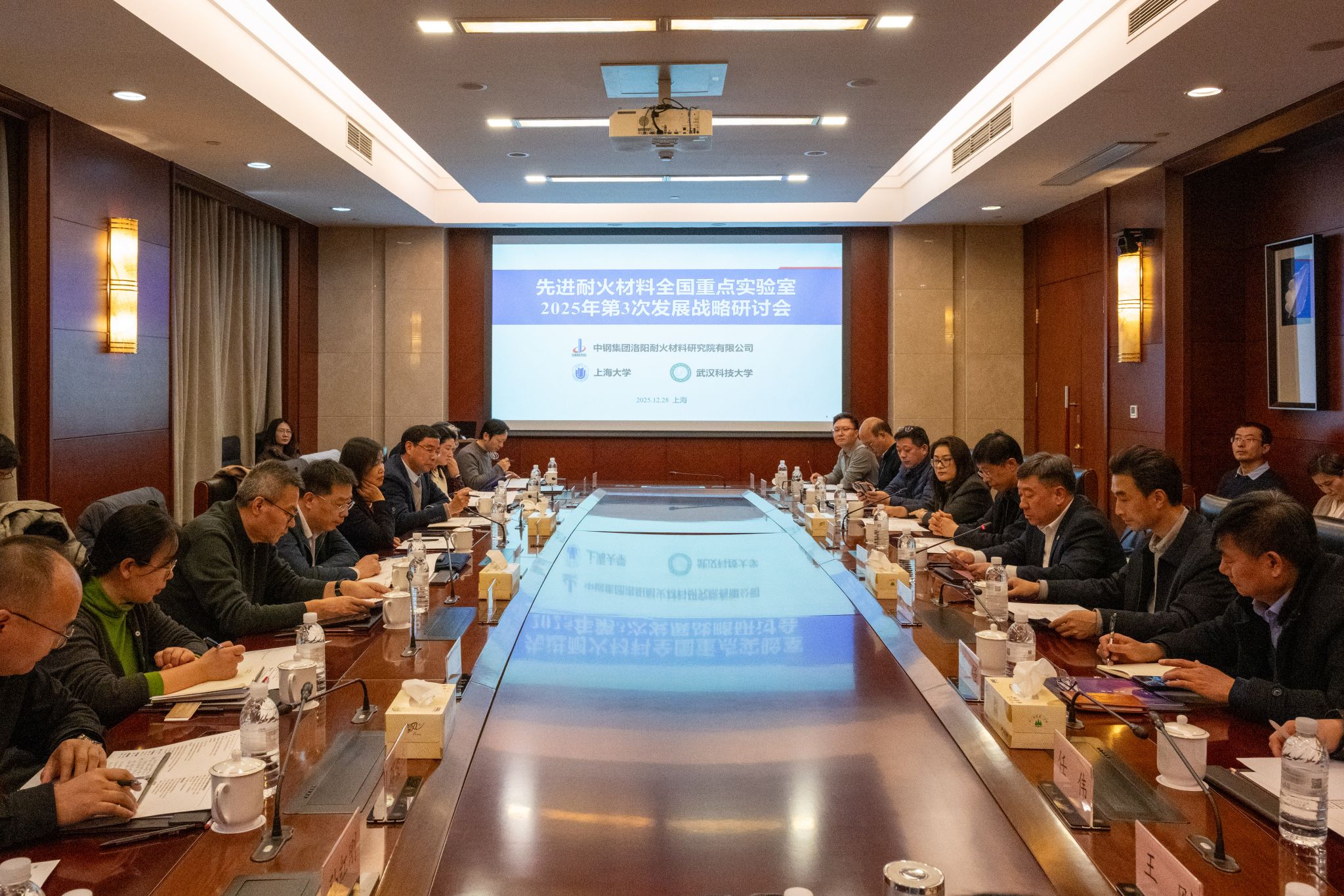 2025年12月28日下午,先进耐火材料全国重点实验室2025年第三次发展战略研讨会在上海大学宝山校区乐乎新楼顺利召开。 上海大学党委书记吴坚勇,中国工程院院士、中国宝武首席科学家、先进耐火材料全国重点实验室主任李红霞,中钢集团有限公司科技创新部总经理弋鹏飞,中钢洛耐科技股份有限公司副总经理、先进耐火材料全国重点实验室副主任王文武,先进耐火材料全国重点实验室副主任、上海基地负责人鲁雄刚,先进耐火材料全国重点实验室副主任、武汉基地负责人李亚伟,上海大学科研管理部高等研究院执行院长、基地与成果处处长邵玮,上海大学科研管理部基础研究与国际合作处处长甄强,上海大学学术委员会秘书处秘书长施鹰,上海大学材料科学与工程学院党委书记黄健,上海大学材料科学与工程学院院长钟云波,上海大学材料基因组工程研究院常务副院长任伟,上海大学材料科学与工程学院副院长邹星礼,以及来自宝山钢铁股份有限公司、中钢洛耐科技股份有限公司、中钢集团洛阳耐火材料研究院有限公司、武汉科技大学和上海大学的全重实验室领导及相关职能部门领导共30余人齐聚一堂,共商全重实验室未来发展大计。