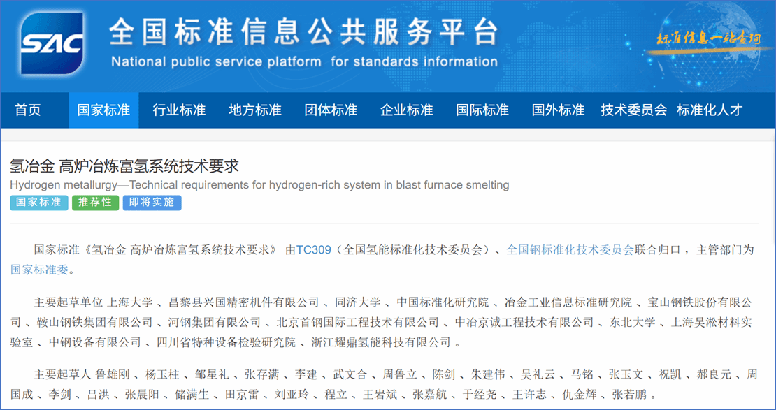 近日,由上海大学牵头的国家标准《氢冶金 高炉冶炼富氢系统技术要求》(标准号:GB/T 47039-2026)在全国标准信息公共服务平台发布,实施日期为2026年5月1日。该标准为首次发布,归口单位为全国氢能标准化技术委员会和全国钢标准化技术委员会,主要起草单位:上海大学、昌黎县兴国精密机件有限公司、同济大学、中国标准化研究院、冶金工业信息标准研究院、宝山钢铁股份有限公司、鞍山钢铁集团有限公司、河钢集团有限公司、北京首钢国际工程技术有限公司、中冶京诚工程技术有限公司、东北大学、上海吴淞材料实验室、中钢设备有限公司、四川省特种设备检验研究院、浙江耀鼎氢能科技有限公司。
