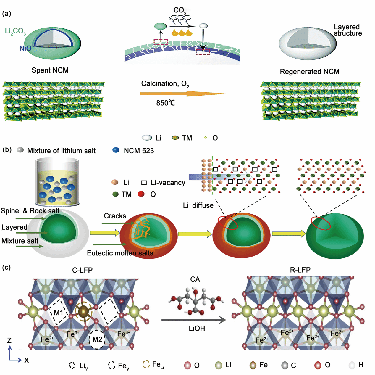 图1 废锂电池化学放电方法 论文特别强调了直接再生技术在处理废旧正极材料方面的显著优势。采用深共晶溶剂(DESs)体系,可在温和条件下实现活性物质的高效浸出与结构再生,避免传统方法的高能耗与二次污染问题。文章还从全生命周期评估的角度,对直接再生工艺的经济效益和环境可持续性进行了综合论述。 直接再生是一种基于正极材料失效机制的新型回收策略,旨在通过结构修复与组分调控恢复其电化学性能,同时保持原有化学组成与宏观结构。LIBs的失效多源于循环过程中的晶体结构畸变与活性锂损失,层状结构材料(如LiCoO₂)尤为典型,常见问题包括层间塌陷、相变和金属离子溶出等。直接再生工艺主要包括脱锂、晶格修复和再锂化三个核心步骤,并通过表面包覆等后处理方式进一步提升材料的循环稳定性与电化学性能。目前,该技术已成功应用于LiFePO₄、LiCoO₂及三元材料(NCM)等多种典型正极的再生,修复方法涵盖固相烧结、共晶熔盐锂化、水热法、电化学还原及其他新兴绿色技术,展现出广阔的应用前景。