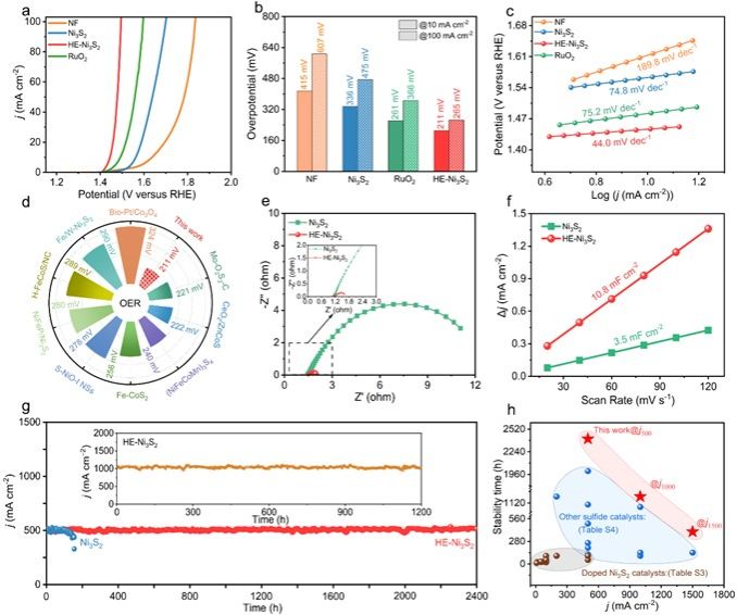 近日,上海大学材料科学与工程学院邹星礼教授团队在国际知名期刊《Journal of Materials Science & Technology》上发表重要研究论文,为解决电解水制氢中的关键瓶颈——析氧反应(OER)催化剂稳定性难题,提供了创新性解决方案。 为实现“绿氢”能源的愿景,电解水制氢是理想技术,但其析氧反应环节存在动力学瓶颈。尽管过渡金属硫化物(如Ni3S2)因优异导电性、反应动力学而被视为替代贵金属的有前景材料,但其自身在反应中结构不稳定的问题,严重限制了实际应用。 近年来,高熵先进功能材料的兴起,为材料设计带来了全新思路。受“高熵效应”启发,研究团队创新性地提出“高熵掺杂”策略,成功开发出一种兼具高活性与超长稳定性的镍硫化物析氧催化剂(图1)。该研究结合原子尺度理论模拟与多维度原位表征技术,系统揭示了高熵掺杂对材料电子结构与催化行为的调控机制,阐明了其性能显著提升的内在原因。