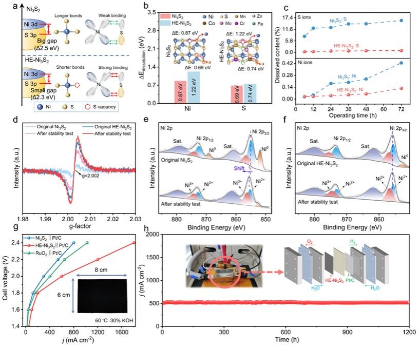 图1 高熵掺杂Ni3S2 OER性能展示 研究发现,高熵掺杂硫化镍存在晶格收缩和紧密的Ni 3d−S 3p轨道重叠,大大加强了Ni-S共价键,减轻了Ni和S的溶解(图2)。丰富的硫空位和镍与掺杂剂之间的相互作用也协同优化了镍活性位点的电子结构和吸附能,从而降低了OER的能垒。得益于此,高熵掺杂硫化镍在1 M KOH中以100 mA cm−2的电流实现了265 mV的超低过电位。更突出的是,其在500 mA cm−2的高电流密度下连续运行2400小时(100天)未出现明显衰减,展现出前所未有的稳定性。在近似工业条件的严苛环境下(60°C,30 wt% KOH),基于该催化剂的电解槽同样稳定运行超过1200小时(50天)。本研究提出的高熵掺杂策略,不仅为设计开发高性能、长寿命的析氧催化剂开辟了新路径,也为推动电解水制氢技术的工业化进程提供了坚实的材料基础。
